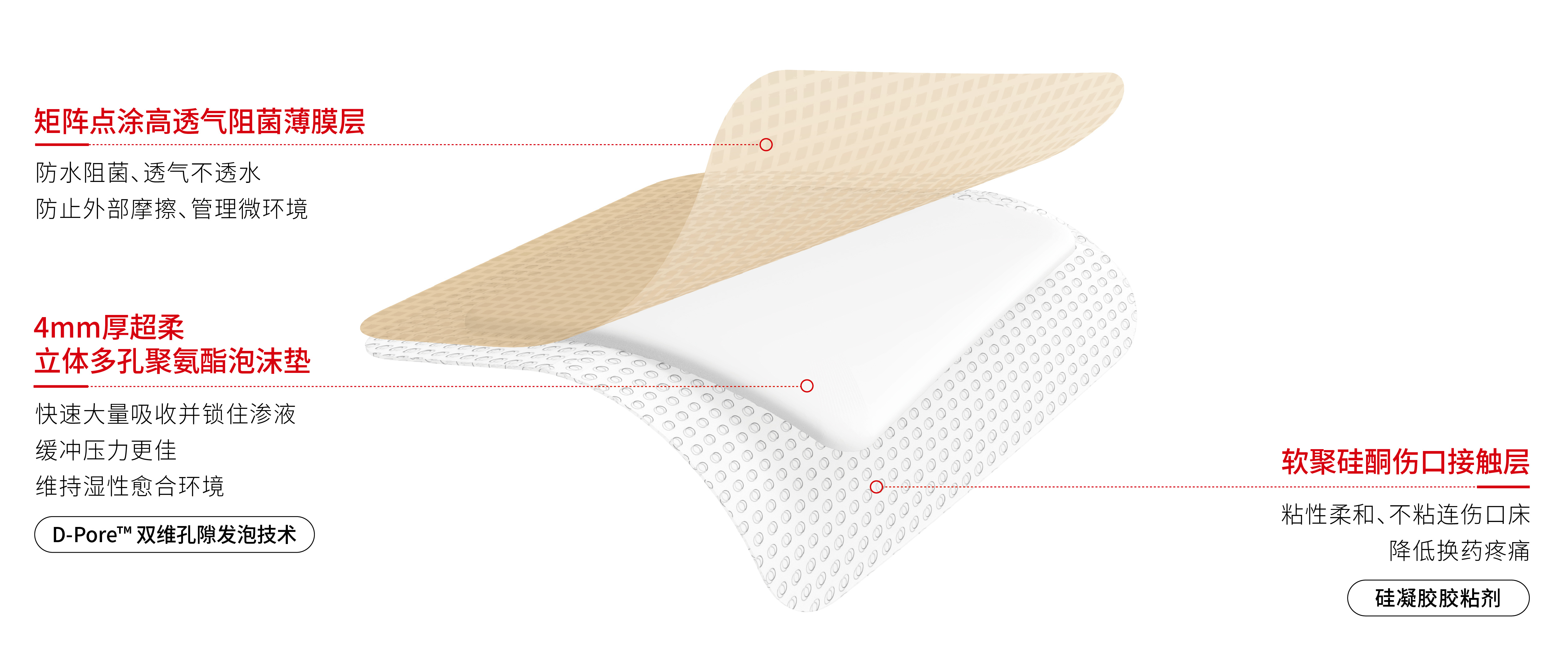 1、加持锁水层,牢牢锁定渗液的同时,增强渗液吸收性能 2、硅胶粘性温和,轻柔揭除,减轻疼痛 3、构建湿性愈合环境,促进伤口愈合 4、软聚硅酮能保持创面愈合过程中的水合减少疤痕发生