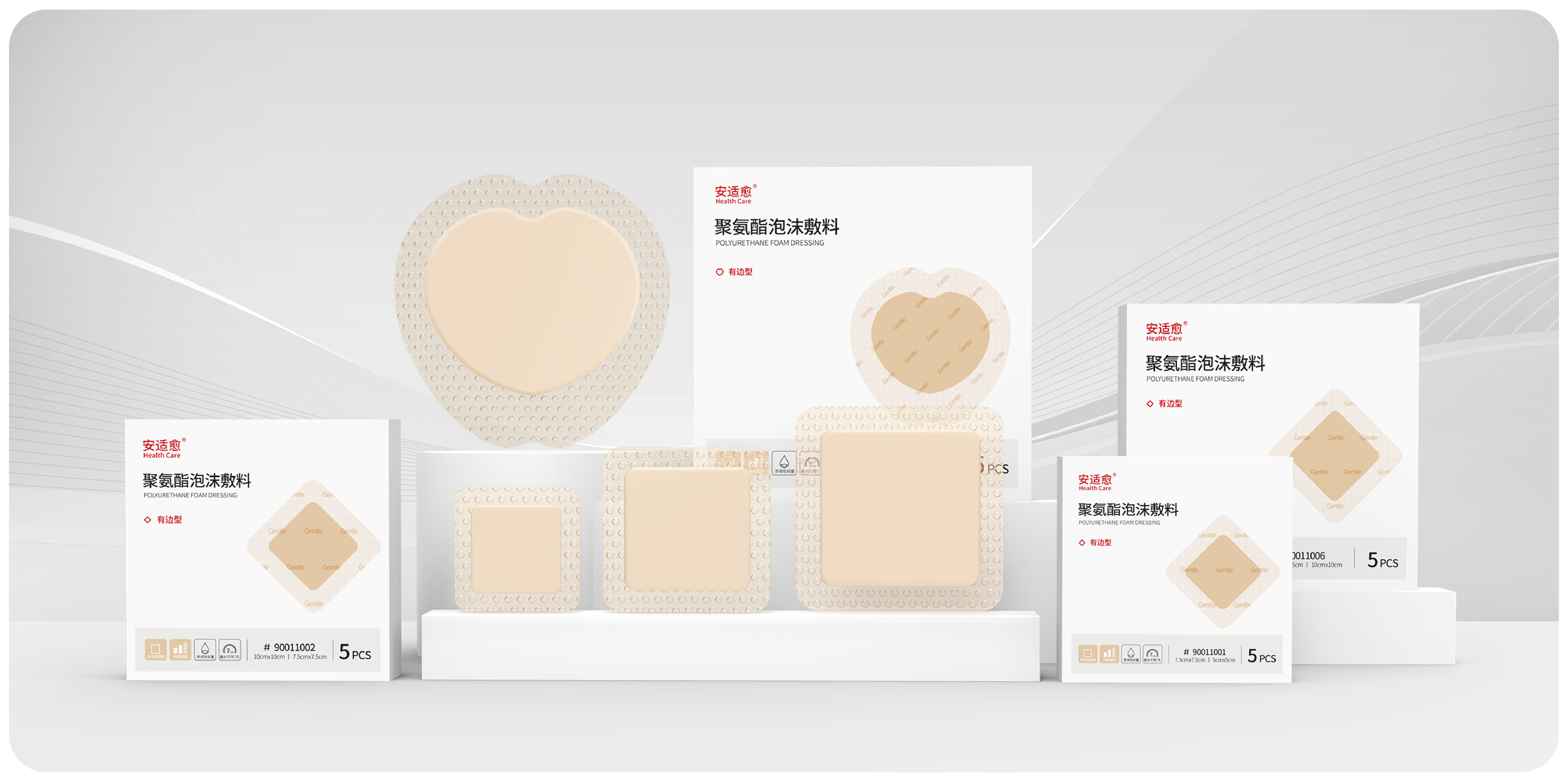 安适愈Ⓡ 聚氨酯泡沫敷料根据人体不同部位的需求,设计了多种不同规格,可灵活运用于临床不同科室及伤口的治疗需求。